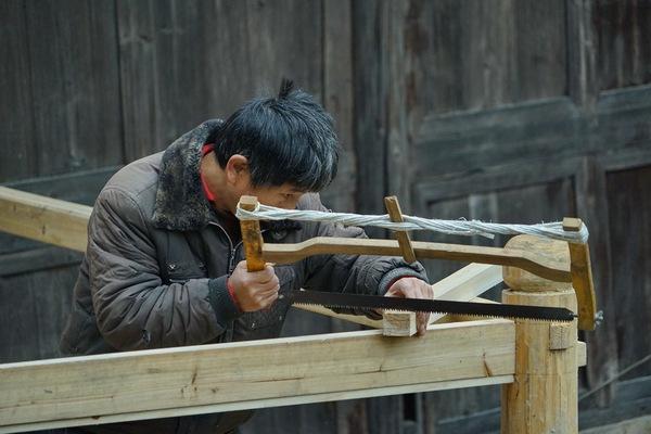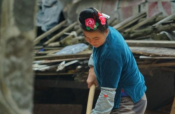 一户农家在维修房屋。西南的很多少数民族的房屋都是吊脚楼,主要使用木材修建,建在山腰上。
