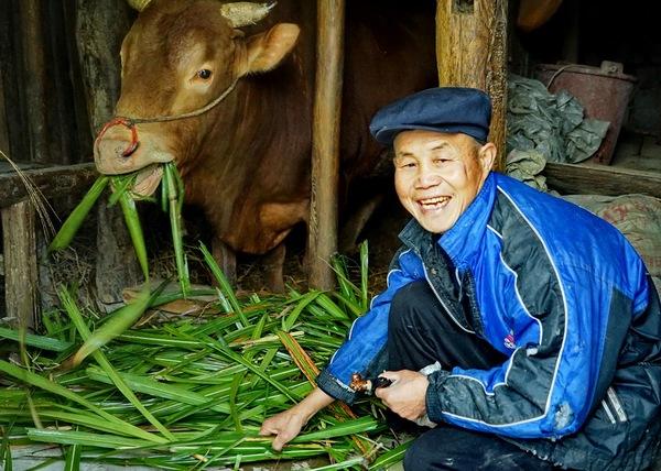转弯看见一个喂牛的老人,我夸他的牛漂亮,老人很高兴,同我聊了很多。他告诉我已经六十五岁了,原来是寨里的会计,现在退休了。他就喜欢养牛,每天去割草喂牛。这头牛有人出一万五买,他舍不得卖。已经是他养的宠物了。
