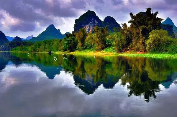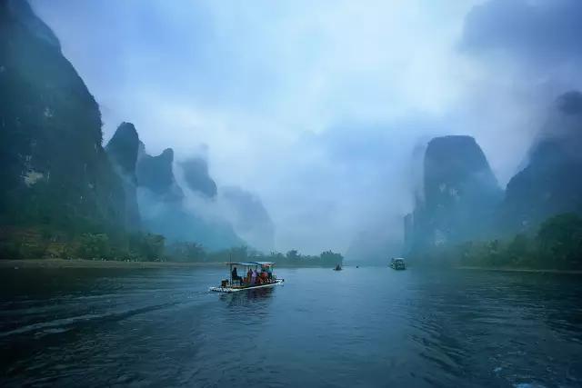 不同漓江不一番风味:晴:清风倒影;阴:漫山云雾;雨:漓江烟雨;甚至阴雨天,但见江上烟波浩渺,群山若隐若现,浮云穿行于奇峰之间,雨幕似轻纱笼罩江山之上,活像一幅幅千姿百态的泼墨水彩画。正是:“桂林山水甲天下,绝妙漓江泛秋图”。