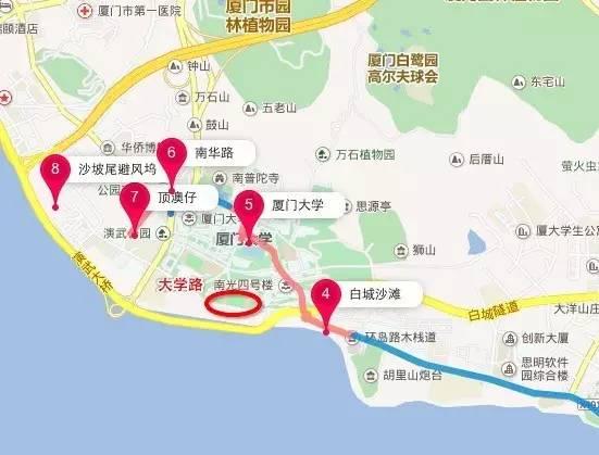 厦门大学一出门便是白城沙滩,从这里开始到黄厝溪头这一段也是环岛路的精华:景点众多,海岸线也是极美的。世界上沙滩很多,但像厦大白城沙滩一样,离青春记忆那么近却是唯一的。据说每个厦大的学生都有白城情结。坐在白城海滩上,喝着冰镇的啤酒,嚼着花生,吹吹海风,听听海浪声。