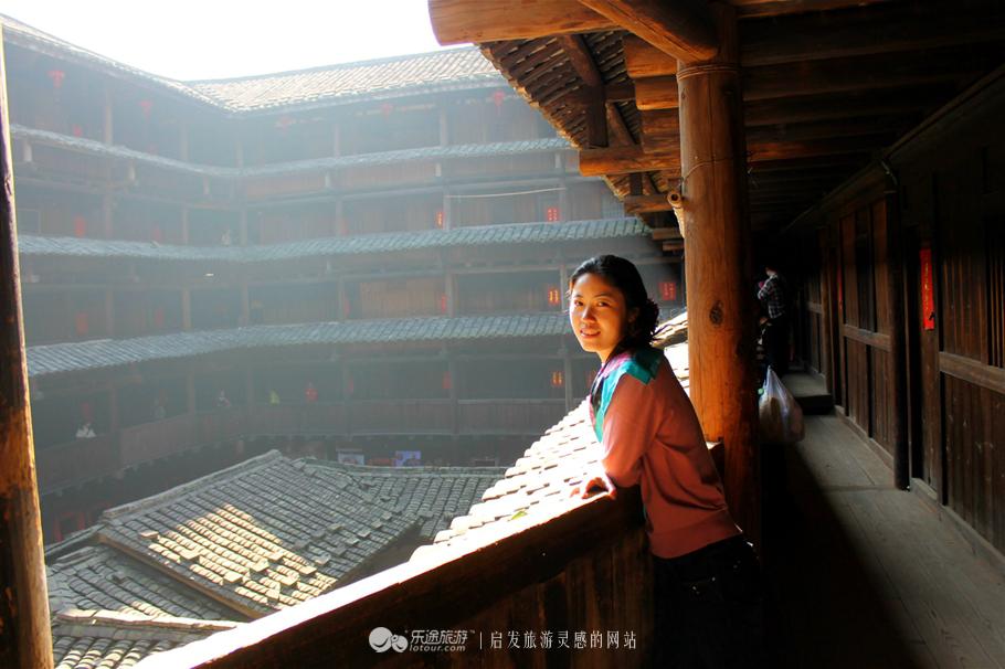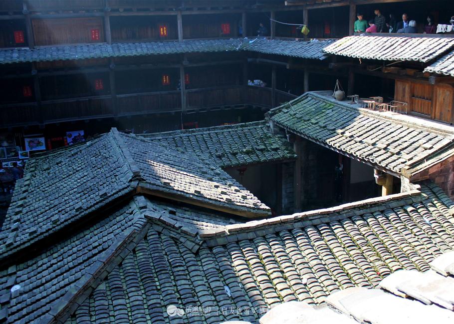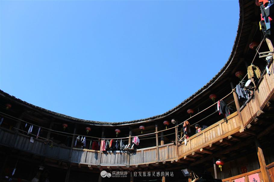 楼内东西南北四角各设梯道通向各层楼。楼梯囗收费的老婆婆不亦乐乎。虽然每层回廊只见游人,但木门前贴着的红色对联,屋瓦上晒着的菜干,展示了无处无在的生活气息。回廊尽头有暸望窗口,几百米外的事物也能一览无遗。