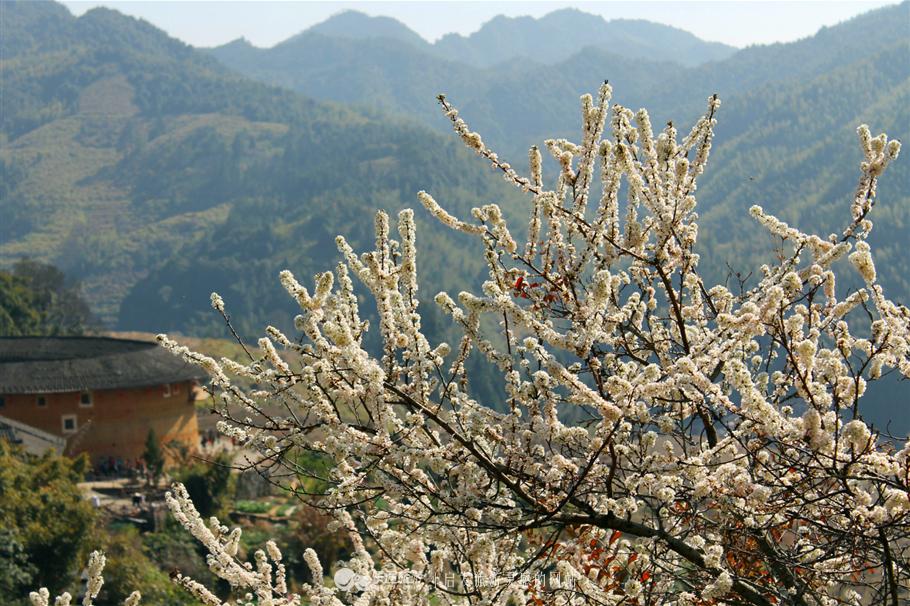 离开田螺坑,沿山路步行前往下一个乘车点。山间风光旖旎,路旁大片大片的梨花盛放,好像白色的云雾缭绕不去。回望土楼群,掩映在山岭之中,似已寂寞千年。