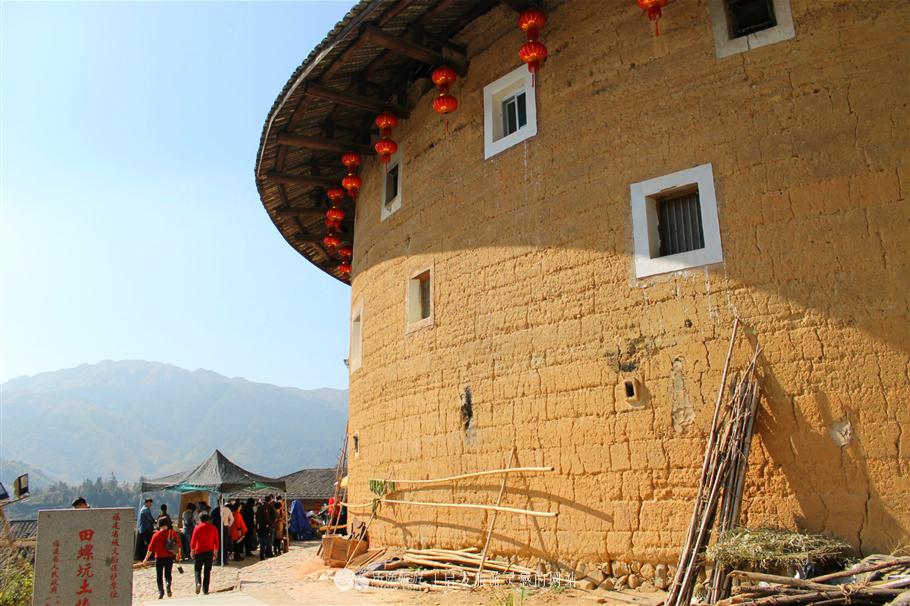 拙朴的灰黄色外墙,看似有不少纵型裂缝,但是实际上异常坚固。百度说,土楼以生土为主要材料,掺上石灰、细砂、糯米饭、红糖、竹片、木条等,经反复揉、舂压、夯筑而成。虽取材普通,却防火防水防震,结实耐用的很。