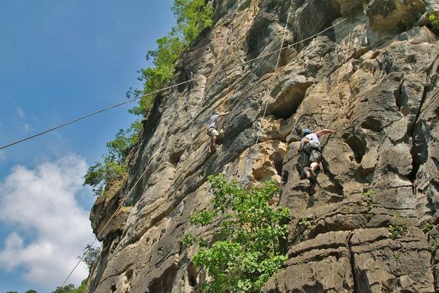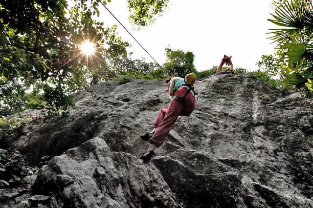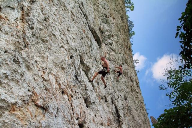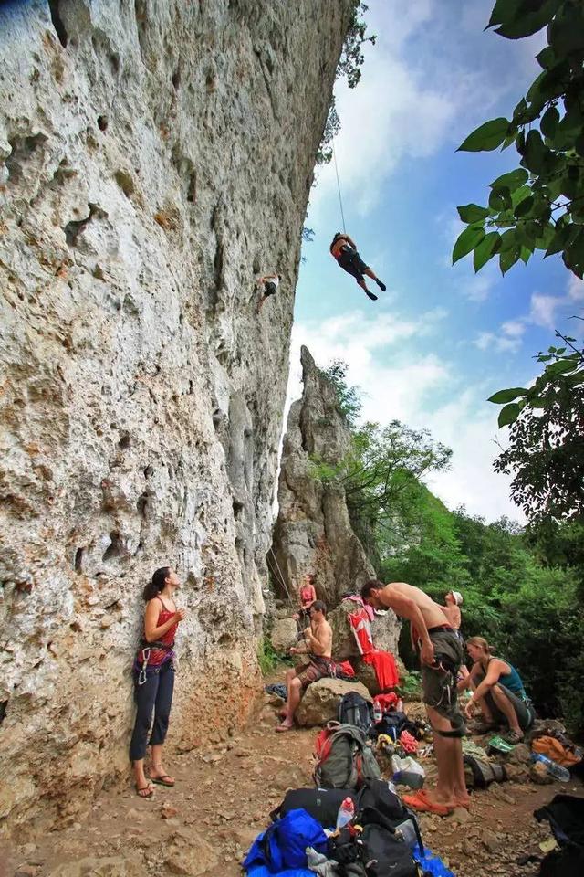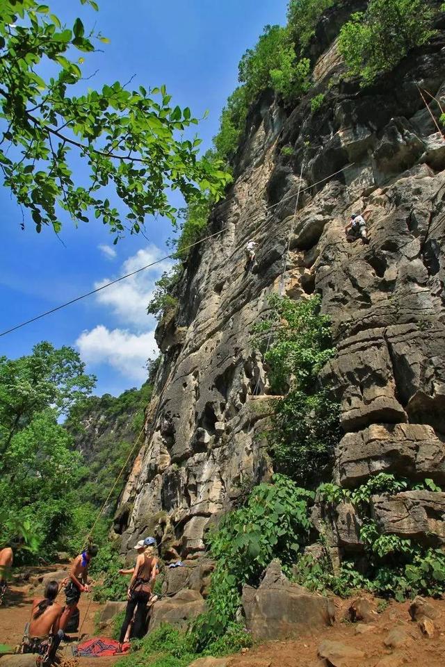 那里的岩壁有的节理发育,有的风化严重,但由于雨量充沛,岩壁上的风化物所剩无几,留下的裂缝和坑洞坚固而又干净,特别适合攀登,就好像是上帝专门为攀岩爱好者开辟的乐园。