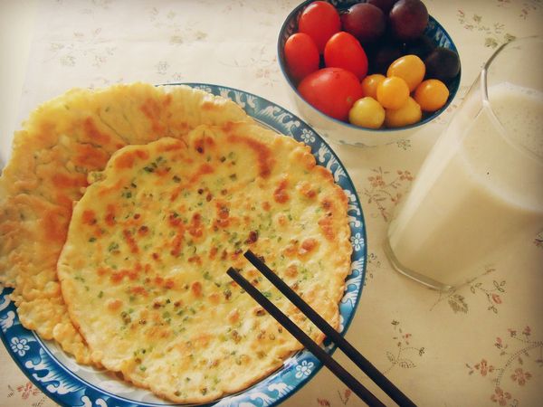 豆浆有时候配吐司吃,有时候自己做鸡蛋饼。面糊里打两个鸡蛋,撒点儿盐和葱花,摊出来很香,要是在面糊里加一点老干妈的香辣菜,做出来的饼就是香辣口味的,很好吃。