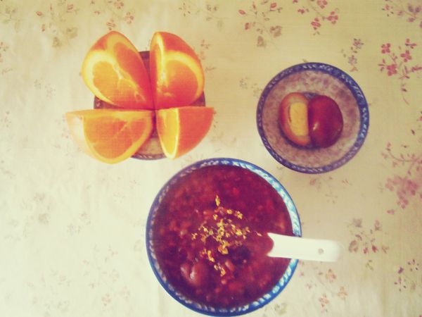 大米、小米、糯米、血糯、西米、燕麦、红豆、绿豆、黑豆、薏仁、红枣、花生、桂圆、莲子、核桃、桃胶、皂荚、枸杞,加冰糖煮成腊八粥,再撒上糖桂花,温暖甜蜜。
