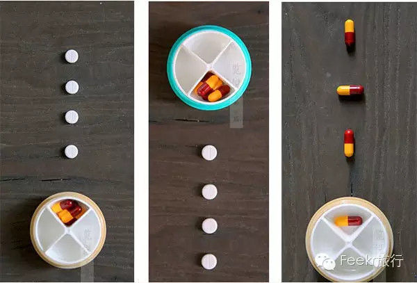 旅行在疯狂也不要忘记吃药~旅行常备晕车药、止痛片、维生素、感冒药统统各就各位,老老实实待在格子里吧。可靠的随身药包和萌萌哒分区药盒,旅行中也要在意的细致关怀。