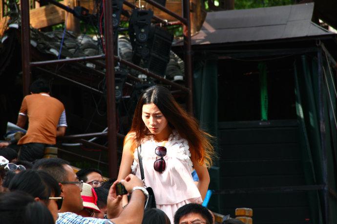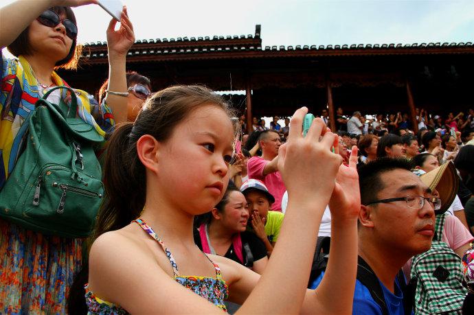 观看苗族舞蹈的小姑娘,精彩的舞蹈录制下来回家慢慢看。