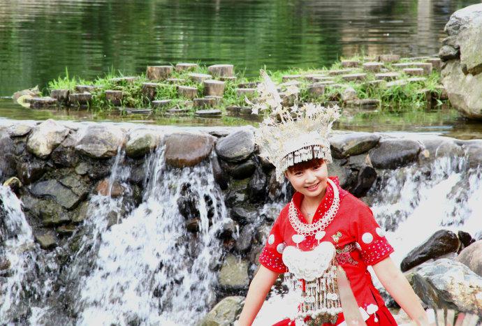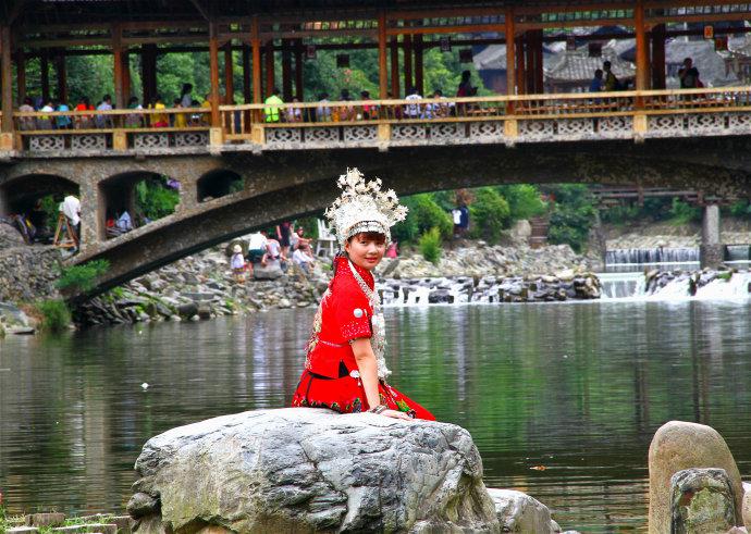 风雨桥下留个影,穿的是苗家人的服饰,但俺是地地道道的汉人啊!