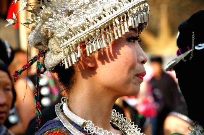 苗寨女人华丽而庄重的银器从头到脚装饰的惊艳迷人。
